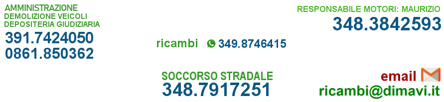 DIMAVI S.r.l., Autodemolizione convenzionata con le maggiori case automobilistiche. Tra i servizi Soccorso stradale e autostradale 24 ore su 24, mezzi pesanti e leggeri, Ricambi ed accessori auto nuove ed usate, Officina meccanica, Motori di tutte le marche, Autocarrozzeria, Vendita autoveicoli commerciali e autovetture usate di provenienza leasing e assicurazioni, Trasporto conto terzi, Riconsegna targhe P.R.A., Depositeria Giudiziaria, Fiduciario Allianz Assicurazioni. Servizio di compattazione.